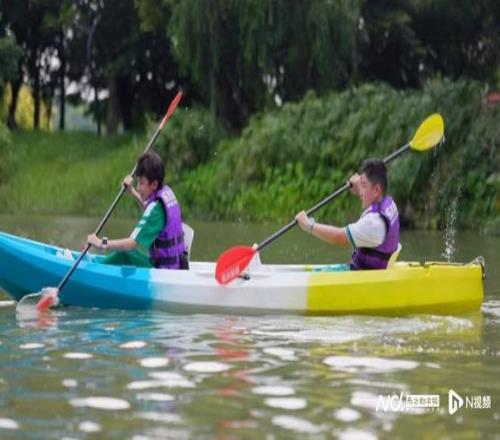 “出發!向著城市中軸線前進!”隨著教練的一聲令下,少年們駕著皮劃艇駛離岸邊。清澈的湖水中,船槳劃出一道道優美的弧線,兩岸的綠意隨風搖曳,偶爾有白鷺從船邊掠過,這樣沉浸式的運動體驗讓大家直呼過癮。