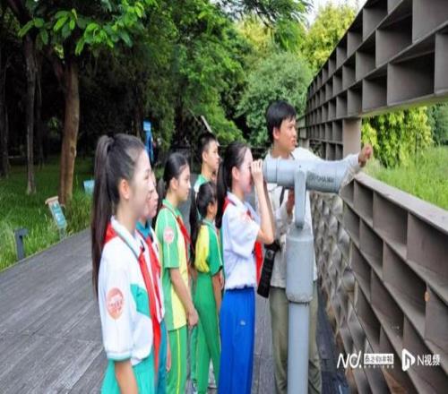 在雁來棲觀鳥棧道上,好少年宣講團駐足欣賞海珠湖美景。隨著海珠濕地自然導師張陸欣的講述,一段與體育賽事緊密相連的城市記憶緩緩展開——2010年,廣州迎來了第16屆亞運會,為兌現“綠色亞運”的承諾,改善城市生態,這片人工湖應運而生。