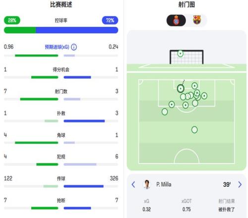 從上半場統(tǒng)計數(shù)據(jù)看,西班牙人的預(yù)期進(jìn)球高達(dá)0.96,巴薩僅有0.24。西班牙人沒能收獲進(jìn)球,完全是因為喬安加西亞的神撲。