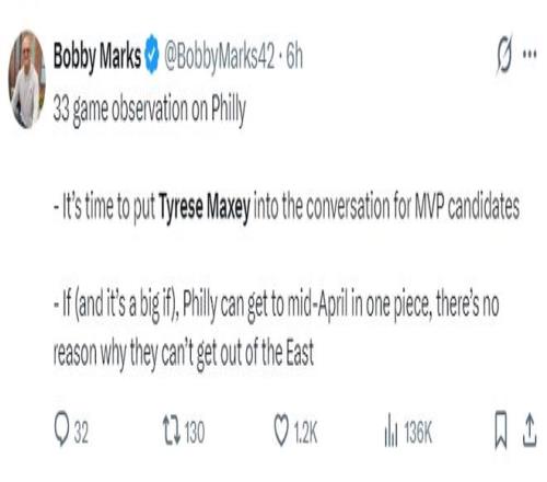 ESPN薪資結構專家鮑比-馬克斯:是時候將馬克西納入MVP候選人行列了,假設費城進入4月中旬全隊都保持健康,那么他們沒有理由不沖出東部。