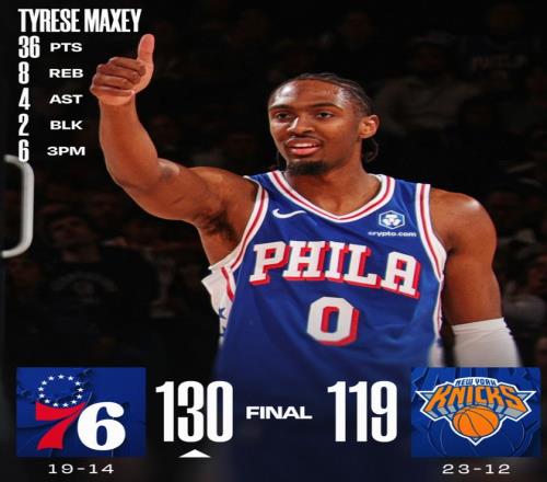 北京時間1月4日,費城76人客場130-119大勝紐約尼克斯拿到三連勝。這場比賽費城一直都手握領先,尼克斯此役讓唐斯、米羅 都復出還是無法擊敗已經形成默契的費城新三巨頭,恩比德、埃奇庫姆、馬克西都拿到20+的數據。