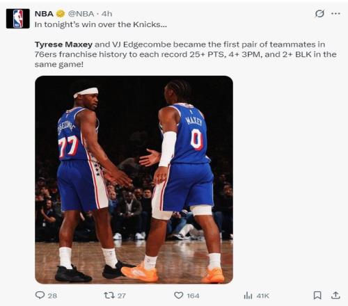 此役他與埃奇庫姆成為費城隊史首對拿到25+4三分+2蓋帽的組合。